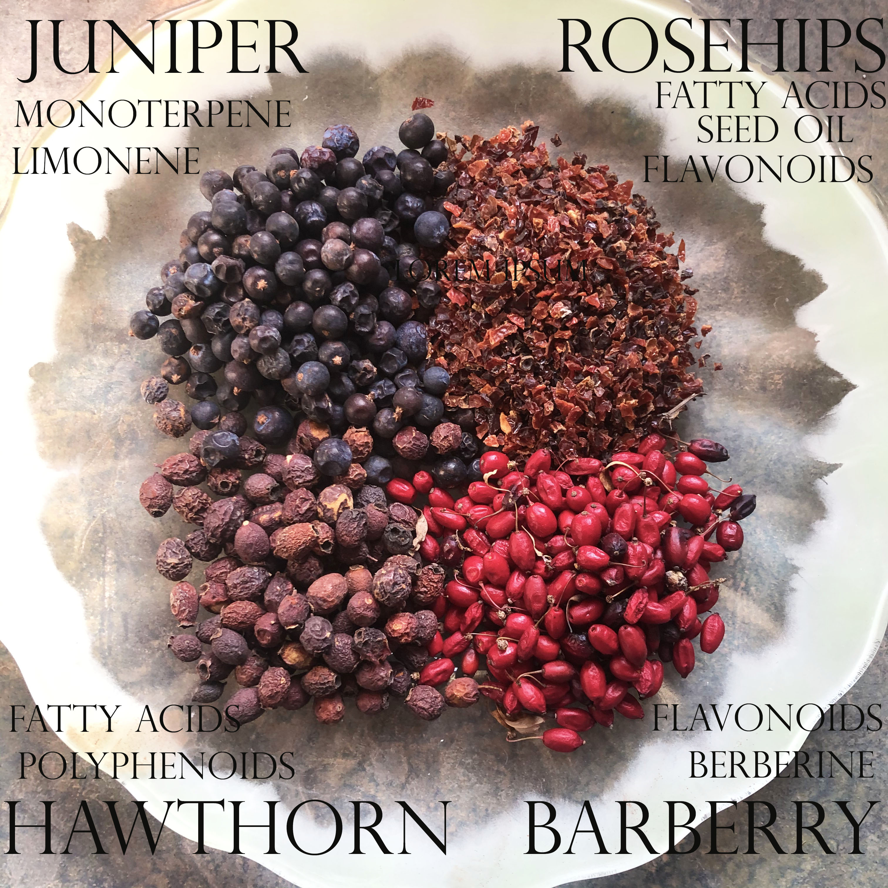 Rosehips, Hawthorne, Barberry, Juniper Berries